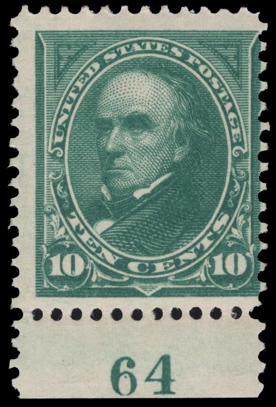 1895, 10c DARK GREEN DOUBLE LINE WMK BOTTOM PLATE #64 SINGLE NH, #273, almost fine, cat. $300.00 (Image)
