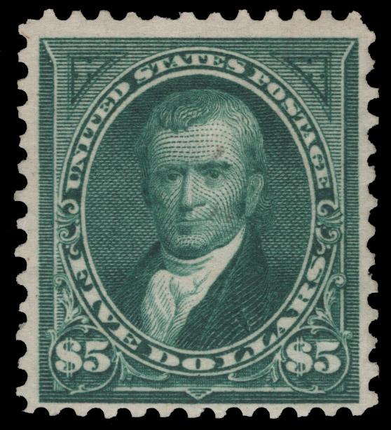 1895, $5 DARK GREEN DOUBLE LINE WMK MINT, #278, fresh and quite well-centered, gum bit disturbed from hinge removal, fine-very fine, cat. $1,900.00 (Image)