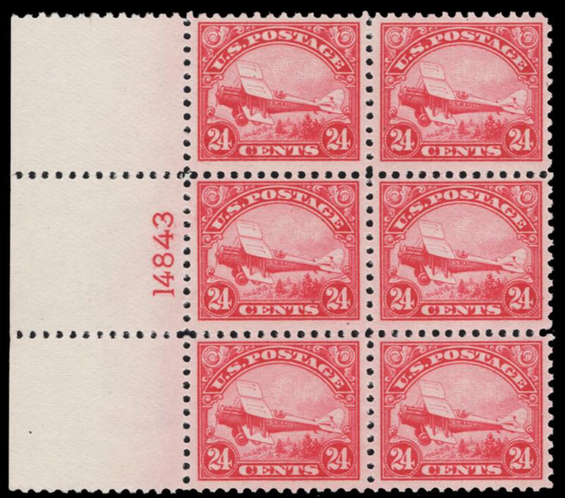1923, 24c CARMINE AIR POST LEFT PLATE #14843 BLOCK OF SIX NH, #C6, fresh and well-centered, very fine, cat. $2,500.00 (Image)