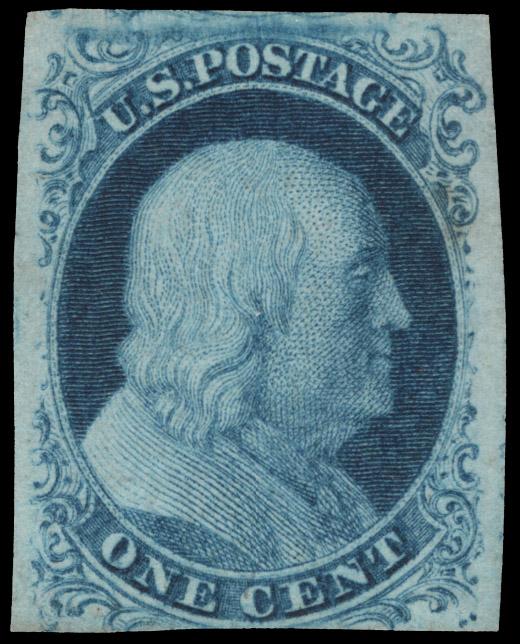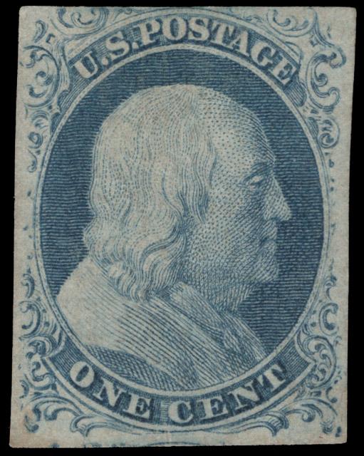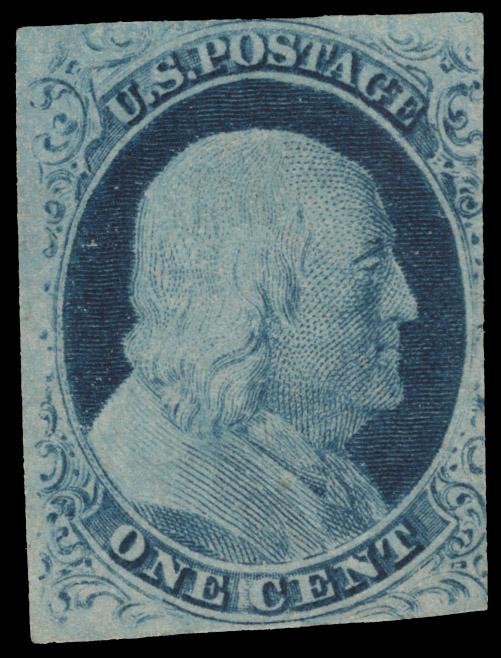 1852, 1c BLUE TYPE IV RECUT AT TOP AND BOTTOM UNUSED, #9, with margins just touching at left, without gum, fine-very fine, cat. $260.00 (Image)