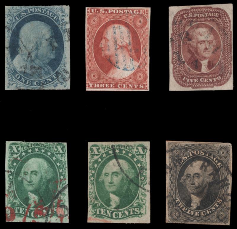 1851-55 ISSUES USED GROUP, #9, 10A, 12, 14, 15, 17, all with small flaws, good-looking group, cat. $1,560.00 (Image)