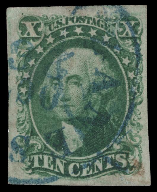 1855, 10c GREEN TYPE II USED, #14, wide margins, blue town cancel, faint toning spots, very fine - extremely fine, with 2025 PSAG cert., cat. $160.00 (Image)