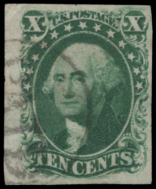 1855, 10c GREEN TYPE III USED, #15, wide margins with selvage at left, grdi cancel, tiny corner crease at top right, very fine, cat. $145.00 (Image)