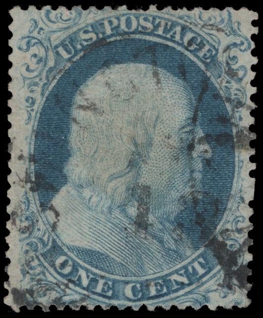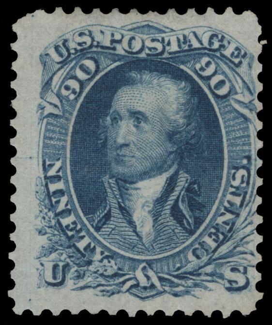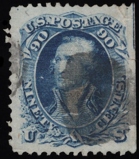 1868, 90c BLUE "F" GRILL USED, #101, well-centered with wide margins, s.e. at right, cork cancel, small faults incl. corner crease and tiny tear, extremely fine appearing, cat. $2,700.00 (Image)