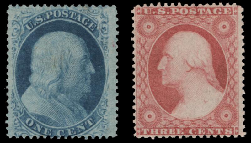 1857, 1c BLUE TYPE V & 3c DULL RED TYPE III MINT, #24, 26, fresh, o.g., previously hinged, fine-very fine, 3c with 1983 P.F. cert., cat. $205.00 (Image)