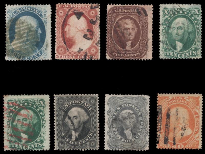 1857-60 ISSUES USED GROUP, 24, 25, 30A, 32, 35, 36, 37, 38, incl. 1c type IV, 3c Red type I, 5c Brown type II, 10c Green type II, 10c Green type V, 12c Black plate 1, 24c Gray and 30c Orange, small flaws, attractive group, cat. $1,980.00 (Image)