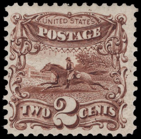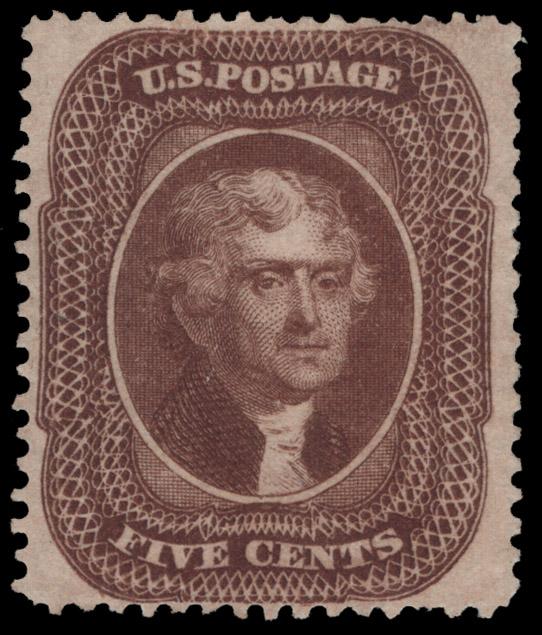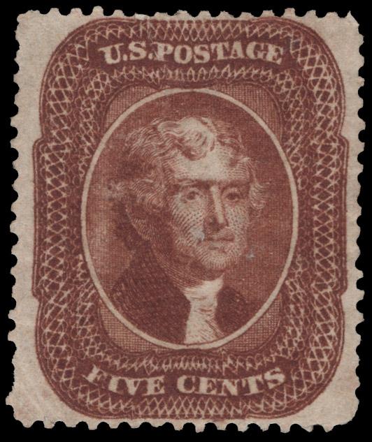 1860, 5c BROWN TYPE II UNUSED, #30A, exceptionally well-centered, short perf at bottom, extremely fine, cat. $850.00 (Image)