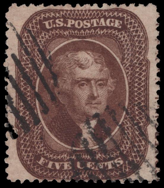 1860, 5c DARK BROWN TYPE II USED, #30A, wide vertical margins showing partial imprint at right, grid cancels, very fine, cat. $375.00 (Image)