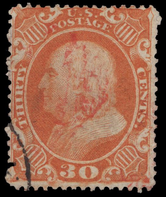 1860, 30c ORANGE WITH MAGENTA & BLACK CANCEL, #38, vibrant shade, fine-very fine, with 2025 PSAG cert., cat. $590.00 (Image)
