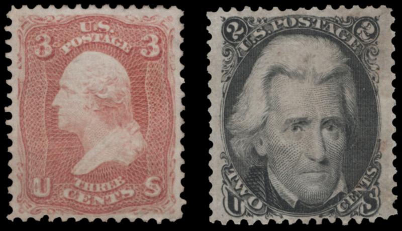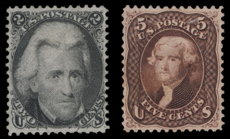 1863, 2c BLACK, 5c BROWN UNUSED, #73, 76, two attractive singles without gum, minute flaws, fine-very fine, cat. $700.00 (Image)