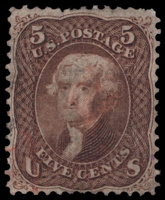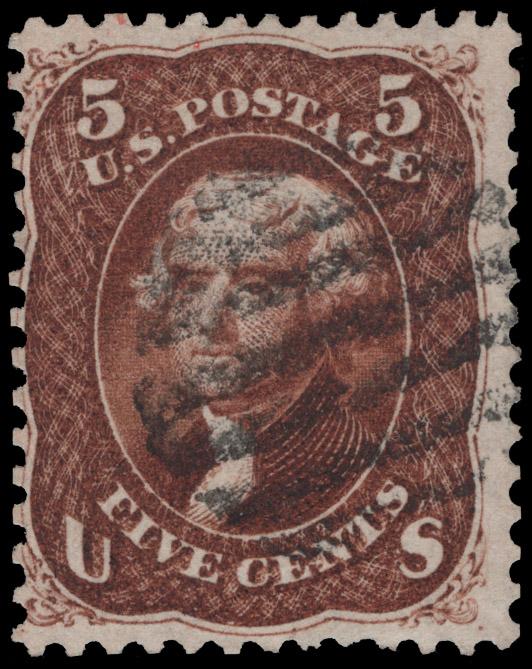 1862, 5c RED BROWN USED, #75, warm shade, grid cancel, small thin spot, fine, signed Brettl BPP, cat. $425.00 (Image)