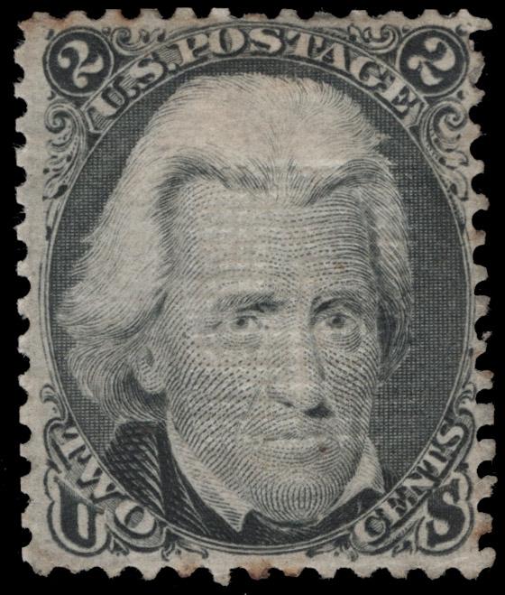 1867, 2c BLACK "E" GRILL MINT, #87, o.g., h.r., light diagonal crease, slight toning around perfs, fine, cat. $1,900.00 (Image)