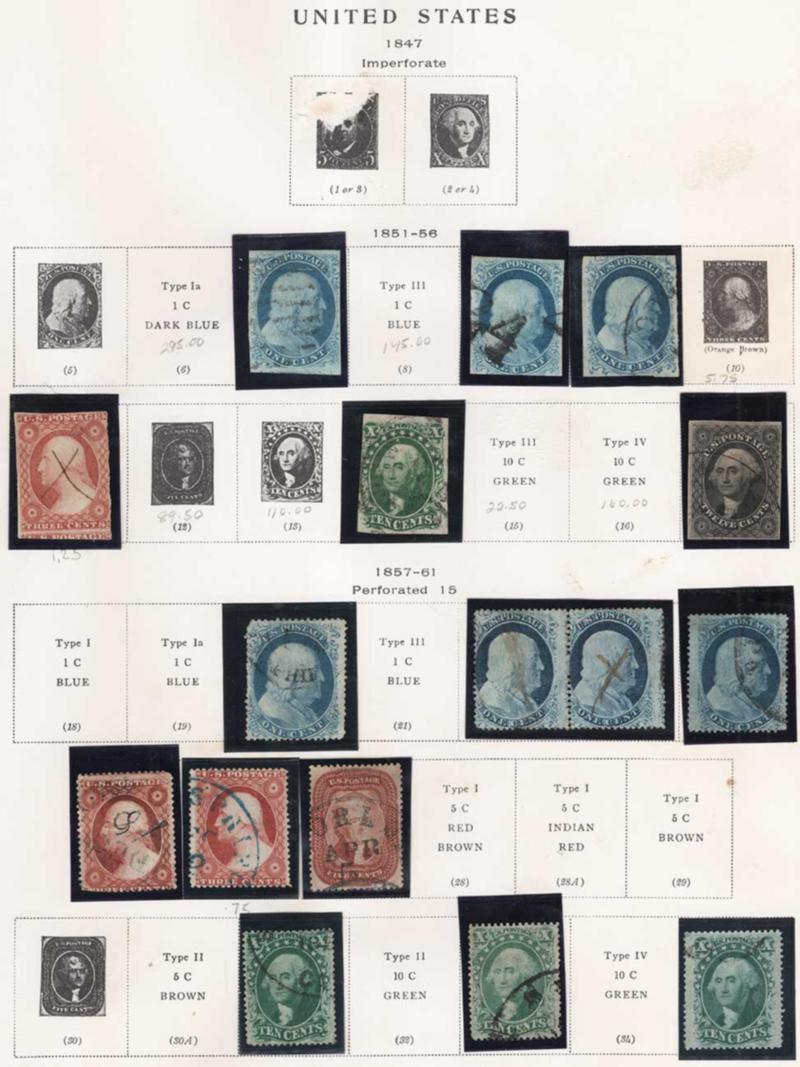 US CLASSICS 1851-61 CLASSICS USED ON ALBUM PAGE cv $5390, incl. several scarce issues such as #8A, 14, 17, 20, 23 pair (pen cancel). 25, 27, 31, 33, few flaws to be expected, presentable and attractive group, cat. $5,390.00 (Image)