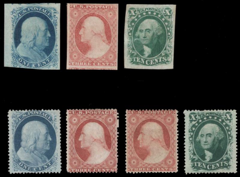 1851-57 ISSUES UNUSED GROUP, #9, 11 o.g., 15 (small surface scrape), 24, 25, 26 o.g. (minute thin), 35, all without gum and sound except as mentioned, fine-very fine, cat. $3,580.00 (Image)