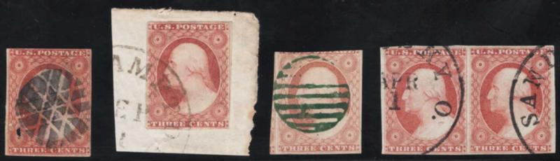 1851, 3c RED (SHADES), three singles and a pair, three singles with P.F. certs., incl. #10A, 11 claret, 11 with green grid, 11 pair, margins as seen in the scans, flaws as in the certs. (Image)