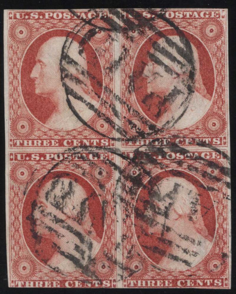 1851, 3c DULL RED TYPE II BLOCK OF FOUR WITH BOSTON PAID CANCELS, #11, margins to in, tiny flaws as mentioned in cert, with 1983 P.F. cert., cat. $1,000.00 (Image)