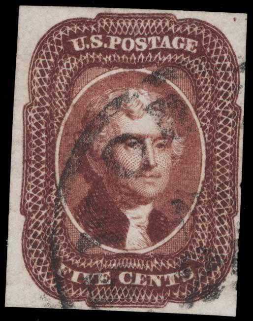 1856, 5c RED BROWN USED, #12, margins all around, town cancel, fine-very fine, cat. $750.00 (Image)