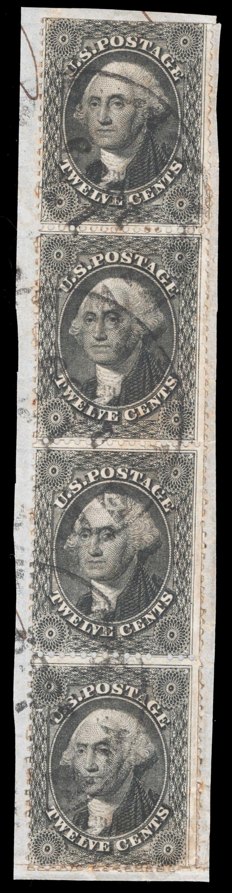 1857, 12c BLACK PLATE 1 VERTICAL STRIP OF THREE, #36, tied to small piece by town cancels, top and bottom scissors separated, perfs cut ff at top, fine-very fine, cat. $1,500.00 as two pairs (Image)