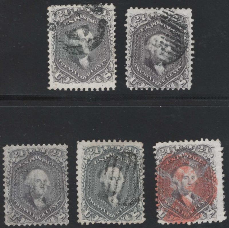 1861-63, 24c RED LILAC/GRAY GROUP OF FIVE IN SHADES, #70/78, two first singles sound, two first in bottom row reperfed, red cancel with crease, quite attractive little group, cat. $1,500.00+ (Image)