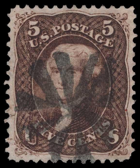 1863, 5c BROWN USED GRADED '90', #76, well-centered, circle of V's cancel, tiny corner crease, extremely fine, with 2010 PSE cert graded '90', SMQ $700.00 (Image)