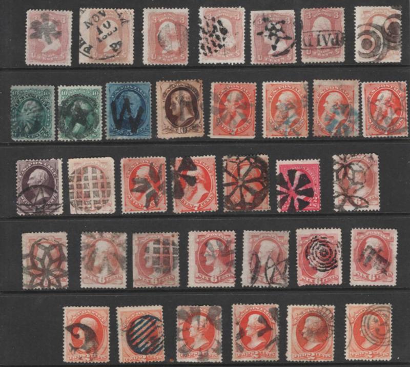 US CLASSIC GROUP WITH CANCELS INCL. FANCY AND NYFM, 3c 1865 and banknote issues with various cancels incl. single #68 with star in circle, group of banknotes incl. a number of NYFM cancels, overall fine-very fine (Image)