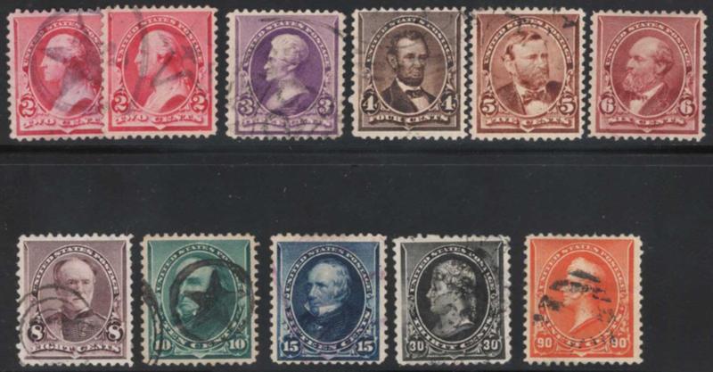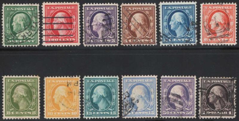 1908-09, 1c-$1 WASHINGTON-FRANKLIN DOUBLE LINE WMK USED SET, #331-42, gorgeous set selected for overall appearance and centering, fine-very fine - extremely fine, cat. $159.05 (Image)