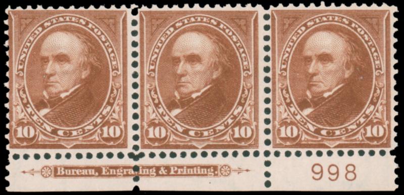 1898, 10c ORANGE BROWN TYPE II BOTTOM IMPRINT PLATE #998 STRIP OF THREE MINT NEVER HINGED, #283, fresh and attractive, fine-very fine, scarce plate multiple, cat. $1,500.00 (Image)