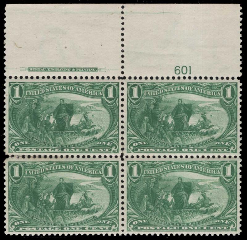 1898, 1c TRANS-MISSISSIPPI TOP IMPRINT & PLATE NO. 601 BLOCK OF FOUR MINT, #285, exceptional centering, very lightly hinged, few perfs hinge reinforced at left, extremely fine, cat. $240.00 (Image)