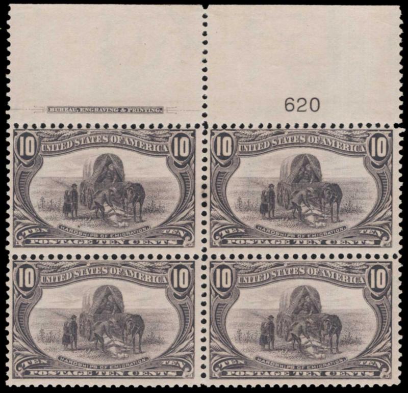 1898, 10c TRANS-MISSISSIPPI TOP IMPRINT & PLATE #620 BLOCK OF FOUR NH, #290, fresh and attractive, fine-very fine, scarce plate block, cat. $3,600.00 (Image)