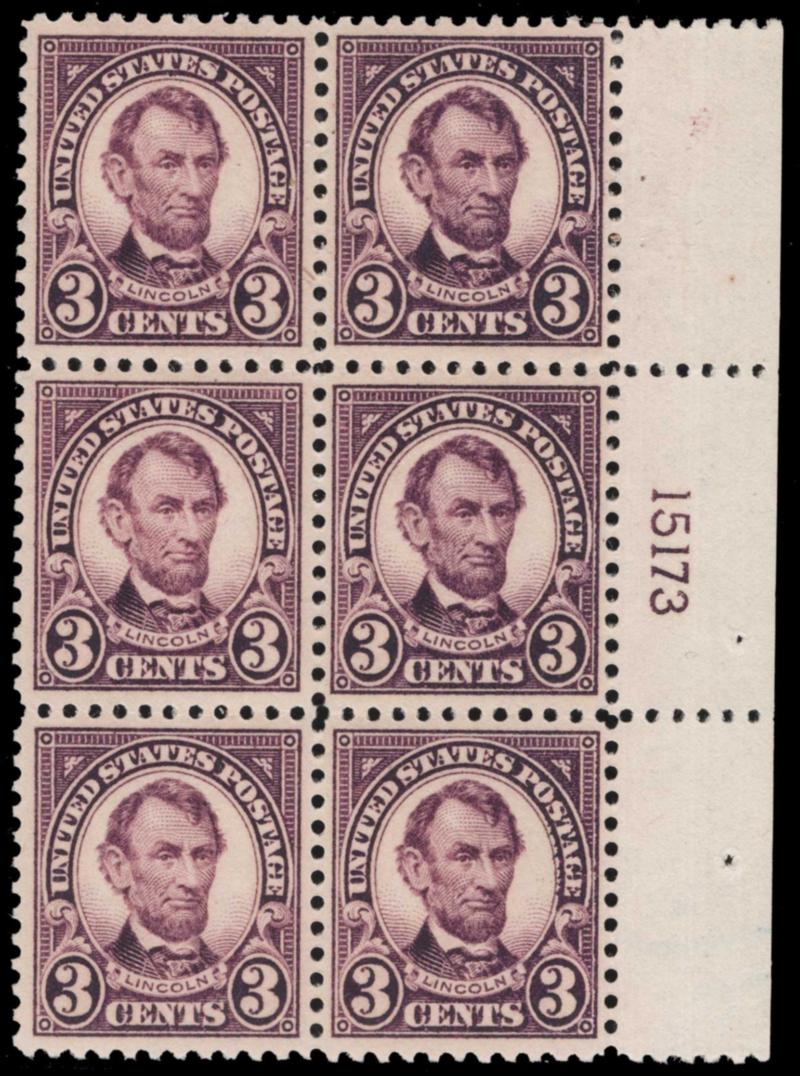 1922, 3c VIOLET RIGHT PLATE NO. 15173 BLOCK OF SIX LH/NH, #555, single stamp in right row LH, five stamps incl. the superbly centered left row mint never hinged, very fine, cat. $240.00+ (Image)