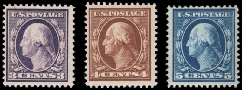 1910-11, 3c-5c WASHINGTON SINGLE LINE WMK NH, #376-78, fresh, fine-very fine, cat. $172.50 (Image)