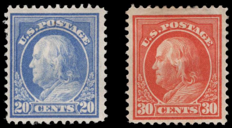 1914, 20c ULTRAMARINE, 30c ORANGE RED SINGLE LINE WMK MINT, #419-20, previously hinged, h.r., fine-very fine, cat. $305.00 (Image)