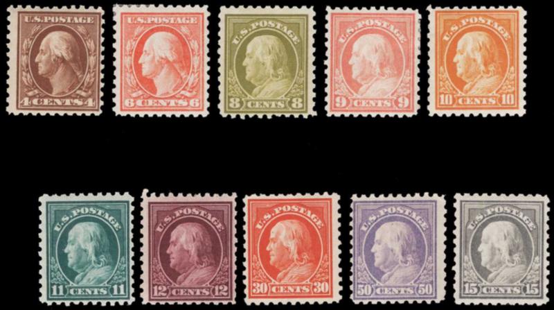 1913-15, 4c-50c WASHINGTON-FRANKLIN PERF 10 SINGLE LINE WMK MINT, #427, 429, 431-435, 439, 440, also 15c w/o wmk (#475), 10c never hinged, others previously hinge, fine-very fine, cat. $1,157.50 (Image)