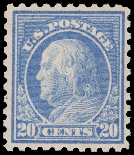 1914, 20c ULTRAMARINE PERF 10 SINGLE LINE WMK NH, #438, quite well-centered, fine-very fine, cat. $450.00 (Image)