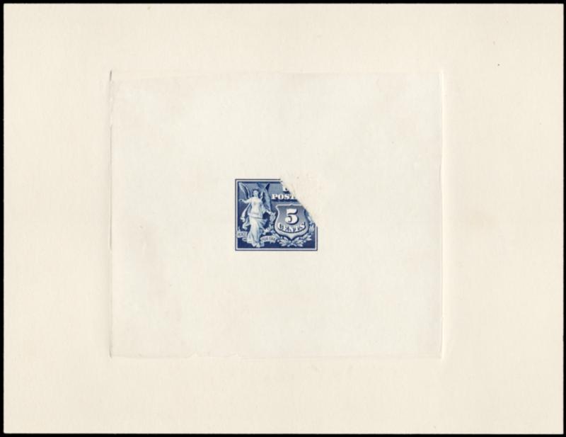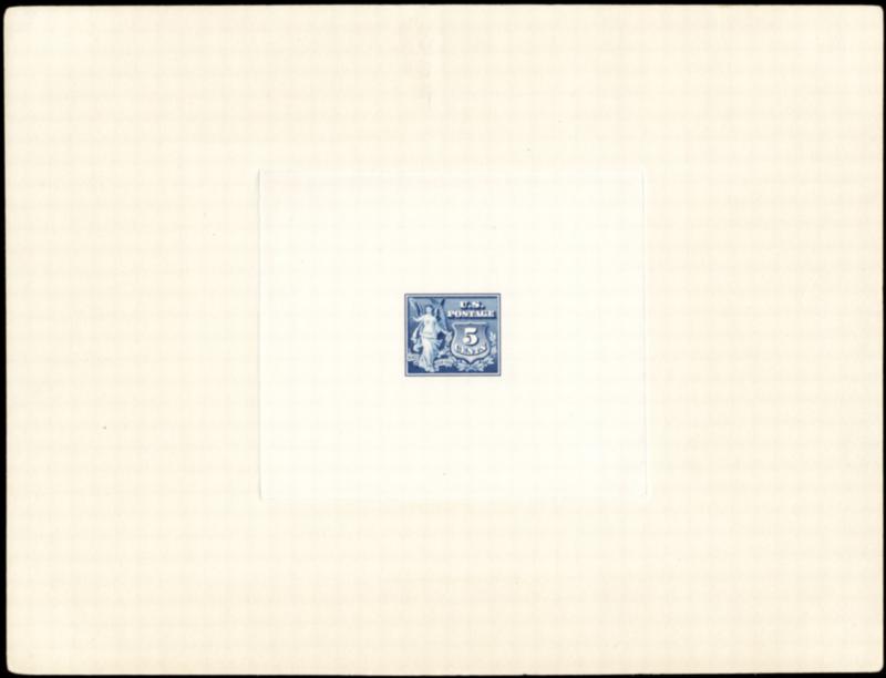 (537E) 5c Blue, Die on Wove, Die Sunk on Large Card, 201 x 159, there is a serial # on back and initialed, sealed tear at T. on the card and well away from the essay, Extremely Fine appearance and certainly quite rare.