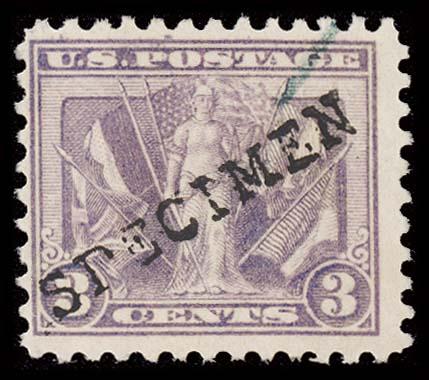 (537S) 3c Violet, "SPECIMEN" Overprint, Unused, blue crayon marking at T., this Specimen is not listed in Scott, fresh and Fine, we are aware of only one other example.