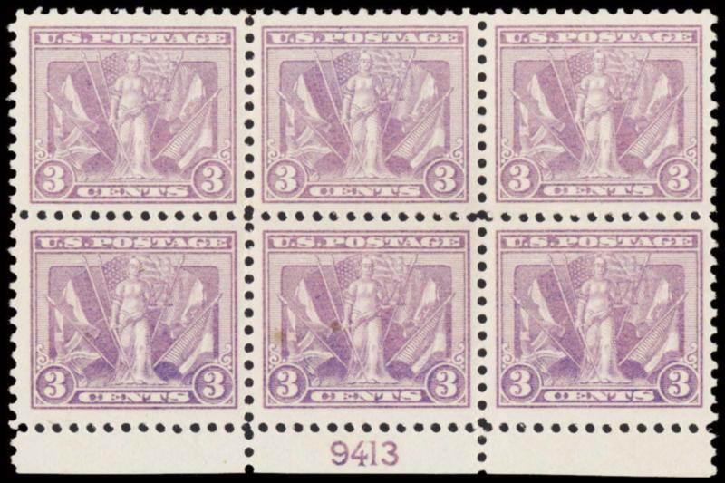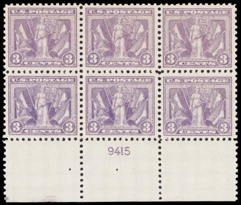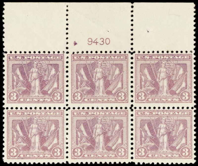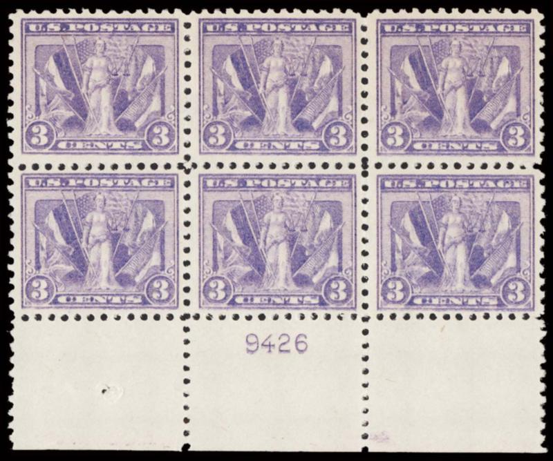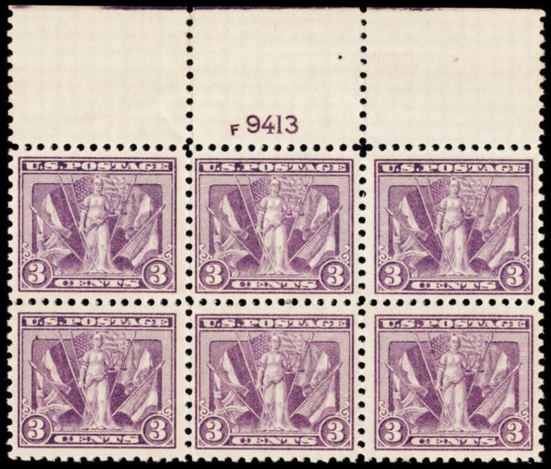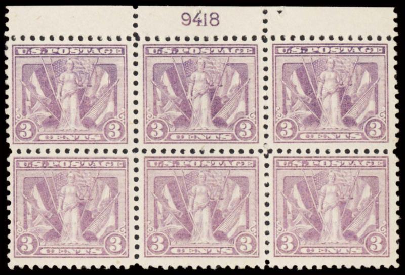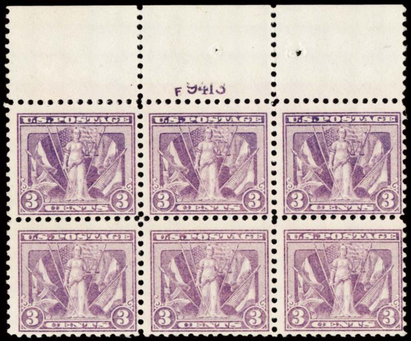 (537a) 3c Deep Red Violet, T. Pl. #F9413 Block of Six, OG, NH, incredible deep dark color and rich impression, full wide top selvedge, usual SH's, there are maybe four plate blocks known - two of which are listed here, this is the only top plate block known, incredible centering with four of the stamps in this block considered Very Fine or better, fresh and certainly the most impressive item in the Victory collection, a wonderful showpiece, it should be noted the catalog value listed is for Fine centering.