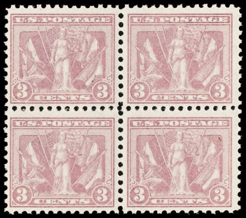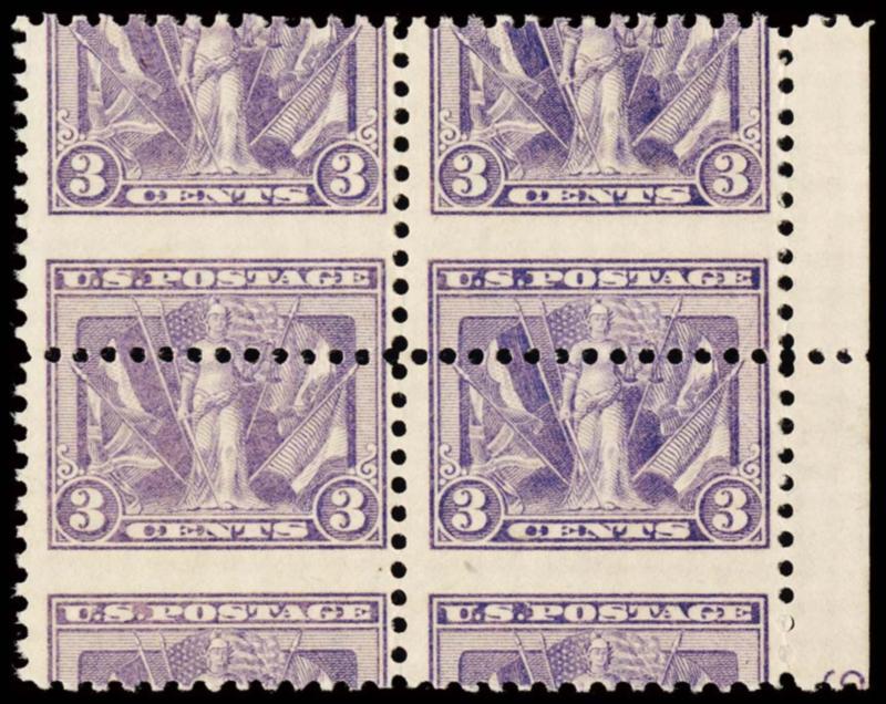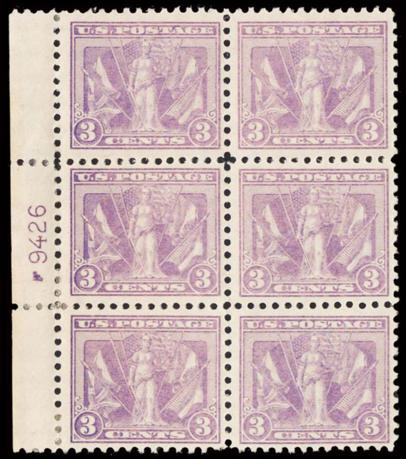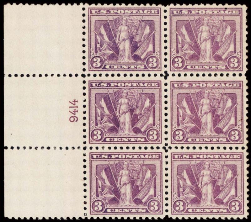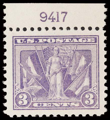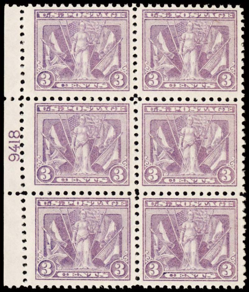 (537a) 3c Deep Red Violet, T. Pl. #F9413 Block of Six, OG, NH, incredible deep dark color and rich impression, full wide top selvedge, usual SH's, there are maybe four plate blocks known - two of which are listed here, this is the only top plate block known, incredible centering with four of the stamps in this block considered Very Fine or better, fresh and certainly the most impressive item in the Victory collection, a wonderful showpiece, it should be noted the catalog value listed is for Fine centering.