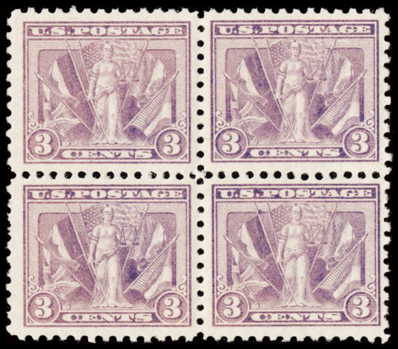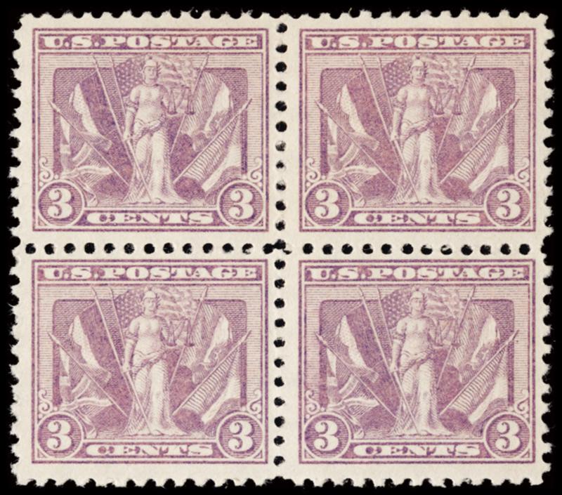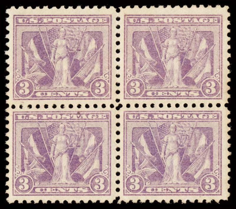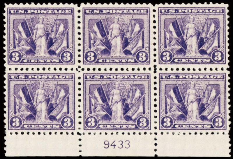 (537(var)) 3c Dark Violet Shade, B. Pl. #9433 Block of Six, OG, NH/H, incredible deep dark color, this shade is not listed in Scott as are the other three listed shades - but it certainly should be, it is significantly darker than even the darker shades of violet that exist on this issue, we have seen perhaps four to five single examples with this shade, it is certainly much more rare than the Deep Red Violet shade, hopefully the editors at Scott will take notice of this variety and get this shade listed in future editions of the Specialized Catalog, this plate block is without question unique in this shade, a wonderful Showpiece item and one of the most important pieces in the Victory collection.