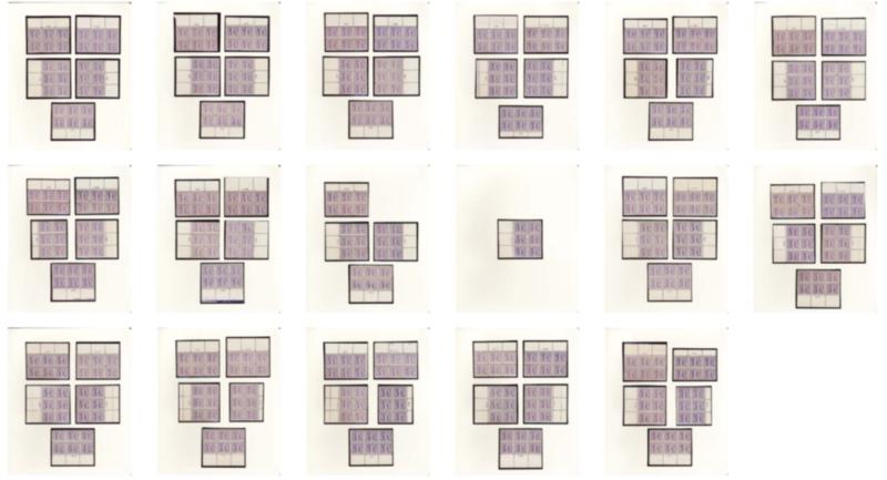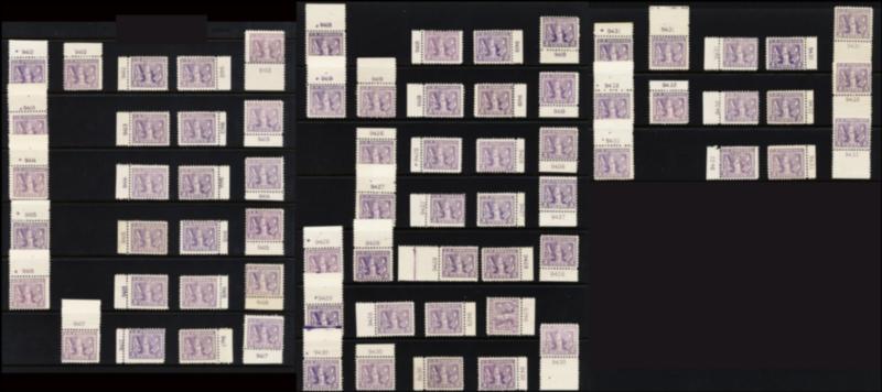 (537) MINT PLATE NUMBER SINGLE COLLECTION OF 70 DIFFERENT, includes 70 different from all five positions of all sixteen plate numbers, sorted onto black stock pages, includes both F tops and tops, many have wide selvedge, there are 25 NH and 45 H, expect some scattered faults, there is one perfin, overall Fine-Very Fine with some very nice singles, includes 70 of the 80 possible plate numbers, a very impressive group.