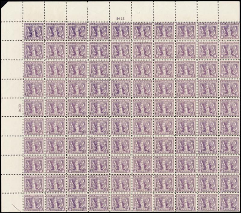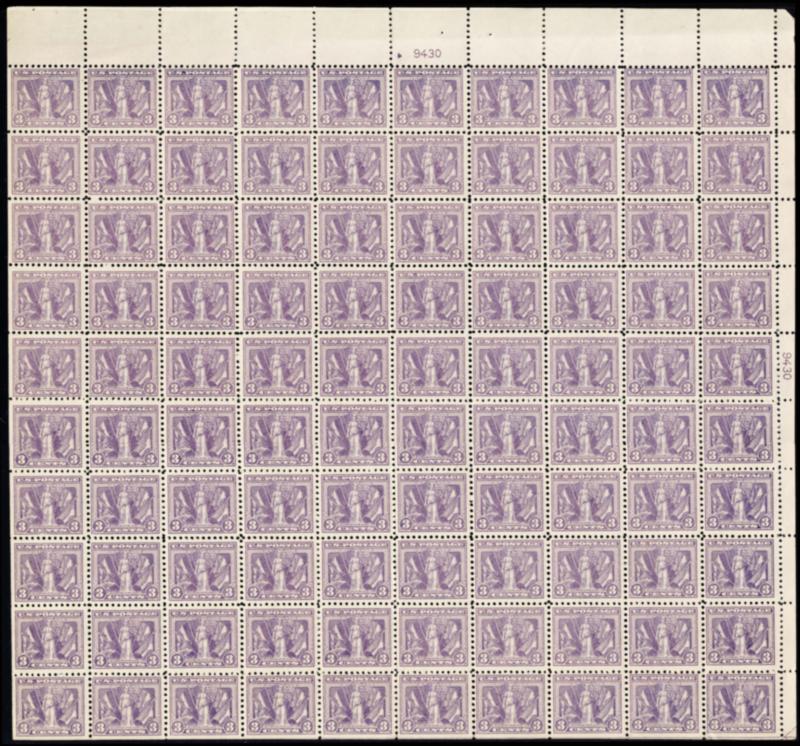 (537) 3c Violet, Mint Sheet of 100, OG, NH, strong color, T.L. Pl. #9432 Sheet of 100, extremely well centered for this issue, quite fresh and Fine-Very Fine, certainly one of the finest existing intact sheets known, the catalog value is for two NH plate blocks and 88 NH singles.