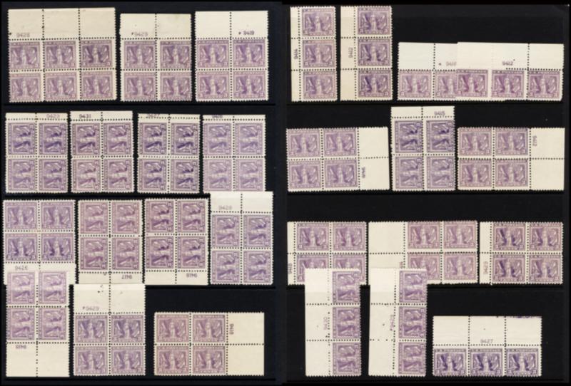 (537) COMPLETE MATCHED SET OF 3c VICTORY PLATE BLOCKS, includes all five positions of all sixteen different plate numbers for this issue, neatly mounted onto album pages by plate number, each number includes a regular Top and also and "F" Top with the exception of #9426 where the "F" position is at Left, this particular position is extremely rare and less than five plate blocks are known, each plate block has been handpicked for quality with 51 of the 80 positions being NH and the balance for the most part is LH or hinged in selvedge, virtually all the plate blocks in this collection have large or full selvedge and there are about 12 Top plates which have full selvedge, there are some scattered NGS's and some with NGW's or NGB's which is totally expected from this era and also given the number of total plate blocks, centering for the most part is Very Fine or better with a few being Gem quality plate blocks, a truly amazing group which took the "Victory" collector more than five decades to assemble the best quality plate block for every position, this is the only complete matched set of Victory plate blocks that has ever been put together especially given the overall superior condition of this collection, many of these plate blocks were purchased at well more than catalog value at the time bought, a impossible set to duplicate and certainly the pinnacle highlight of the Victory Collection.