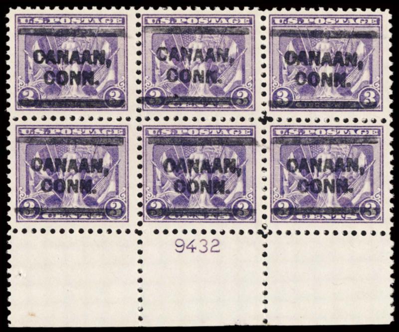 (537) 3c Violet, B. Pl. #9432 Block of Six, PC, "Canaan Conn.", OG, NH, deep dark color, fresh and Fine+ example of this very rare used plate block, a great looking multiple.