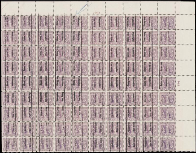 (537) 3c Violet, T.R. Pl. #F9413 Block of 90, missing bottom row for the sheet of 100, PC, "Weehawken New Jersey", blue crayon in selvedge at T., mostly OG, NH, this sheet was cancelled with a 25 subject device where the top half of the sheet is reading down and the bottom half is reading up, a most unusual and rare large multiple.