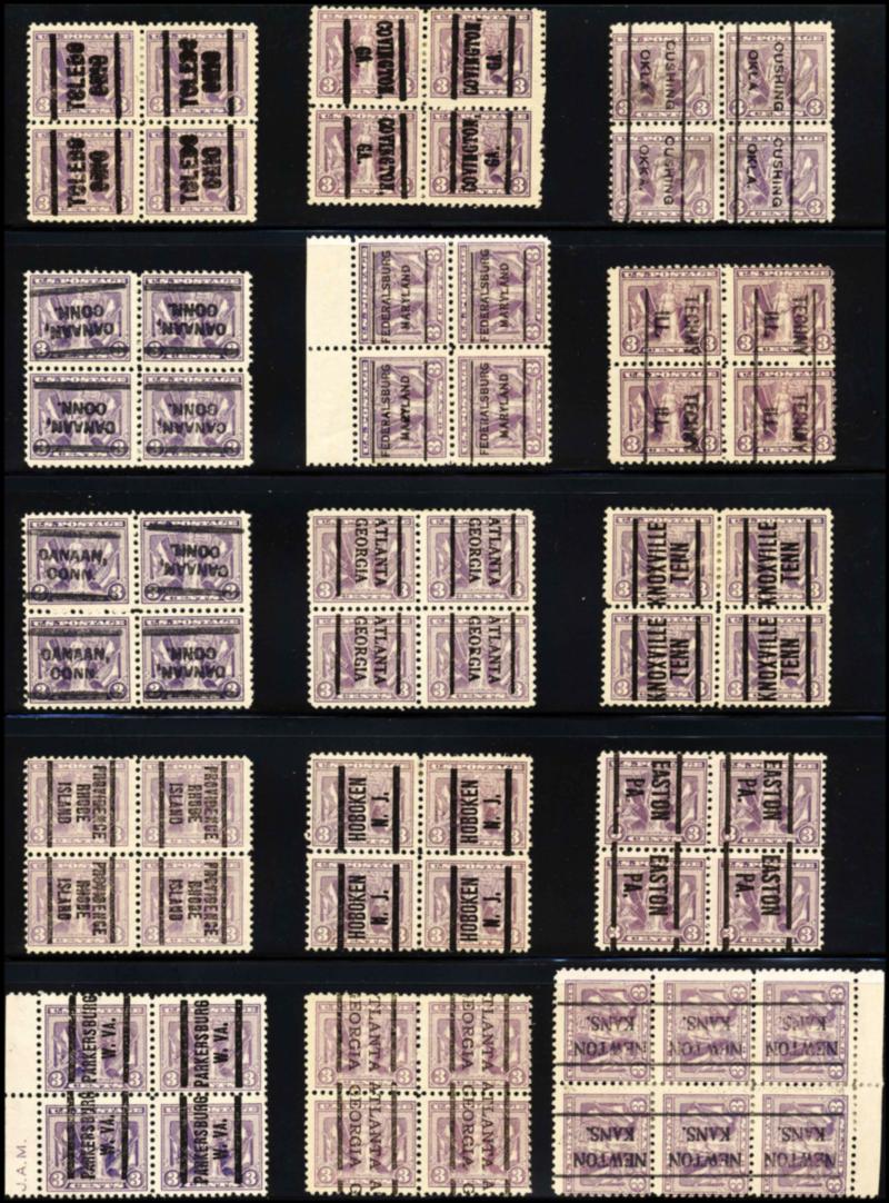(537) PRECANCEL BLOCKS OF FOUR GROUP, includes 15 different PC blocks of four, sorted onto a black stock page, most are OG, NH, most are Bureaus, all different with some reading up and down, some scattered faults, overall Very Fine, scarce group.