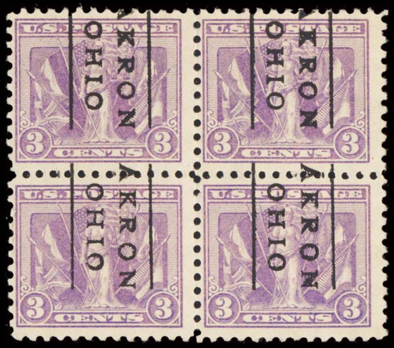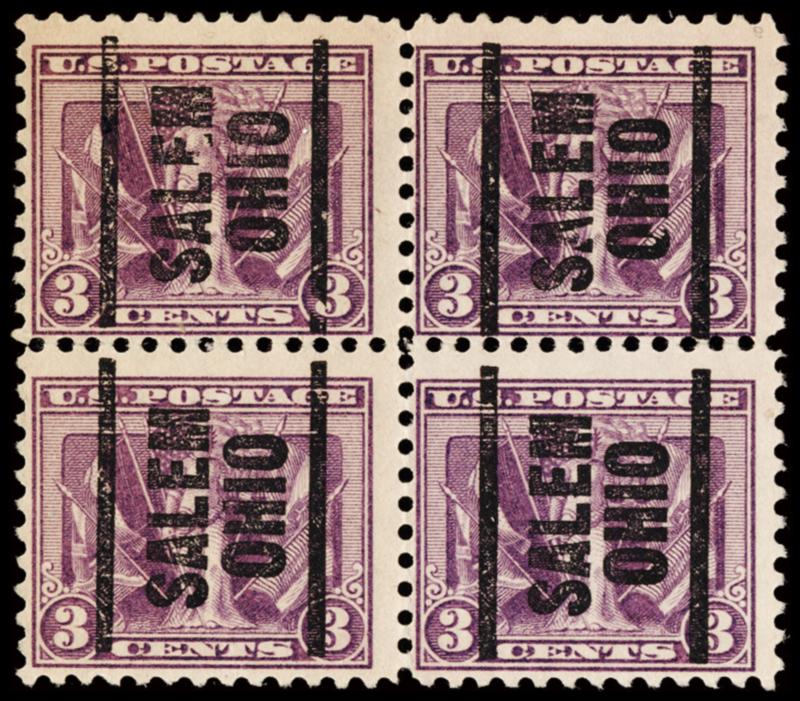 (537a) 3c Deep Red Violet, Block of Four, PC, "Salem Ohio", wonderful sharp color and rich impression, fresh and Fine example of this exceedingly rare multiple with apparently only three blocks known with this pre-cancel, the catalog value is for Fine centering, a wonderful showpiece from the Victory collection.