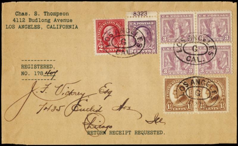 (537b) 3c Light Reddish Violet, Block of Four tied by cancel on 1925 Registered cover to Chicago, Ill, includes three other stamps, the block has great color and is Fine, just a single on cover catalogs $250 and only a few blocks of four are known on cover, some edge faults and reduced at R., a very attractive and scarce cover.