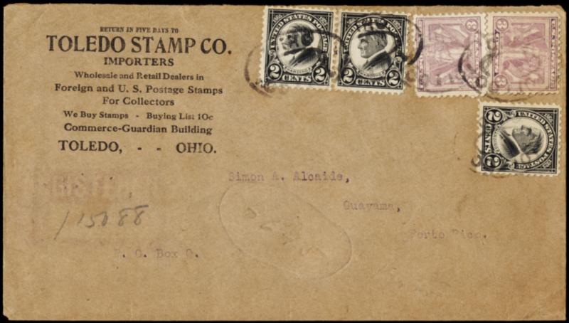 (537b) 3c Light Reddish Violet, Two singles tied on a brown 1924 Registered advertising cover to Guayama, Puerto Rico, includes three other stamps, the sender is the Toledo Stamp Co. in Toledo, Ohio, a very attractive cover, the catalog value listed is for a single stamp on cover.