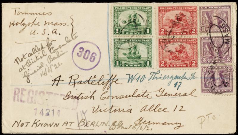 (537c) 3c Red Violet, Pair and single tied on 1921 Registered cover to Germany, includes pairs of #548-49, addressed to the British Consulate General, remarked "Not Known at Berlin", includes a Germany Airmail 40pf issue which is tied sending this cover back to Holyoke, Mass. since it went undelivered, several various transit handstamps on back, some edge wear and minor faults, a most unusual and certainly scarce cover.