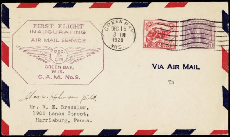 (537c) 3c Red Violet, Tied on 1928 Roessler First Flight Cover, C.A.M. No. 9, to Harrisburg, Penna., includes a #629, the cover is also signed by the Pilot: Chas. W. Holman, quite fresh and Extremely Fine, a very attractive cover.